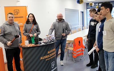 Bälle sammeln und ablegen? Eigentlich für viele unserer Schülerinnen und Schüler mit Konsolen-Erfahrung ein Kinderspiel. Aber mit einem echten Bagger Tennisbälle mit einem Greifarm hochhieven und in einen Eimer bugsieren? Das erfordert praktisches Können, und darum ging es letzte Woche bei unserer Berufemesse in der Mensa und auf dem Schulhof. Ausprobieren und mitmachen, um zu motivieren für vielfältigste Berufe. Mit dabei waren diesmal für das Handwerk unsere Kooperationspartner Ernst Petershagen (Straßen-, Kanal- und Rohrleitungsbau) und die Firma Christoffers (Anlagen- und Gebäudetechnik).