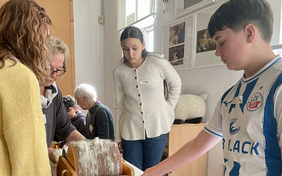 Ein besonderer Höhepunkt war der Praxisteil des Programms. Hier konnten die Kinder selbst ausprobieren, wie Wolle verarbeitet wird und welche Arbeitsschritte nötig sind, um aus Rohwolle schließlich Garn herzustellen. Mit viel Neugier und Begeisterung arbeiteten sie aktiv mit und lernten dabei viel über traditionelle Handwerkstechniken.